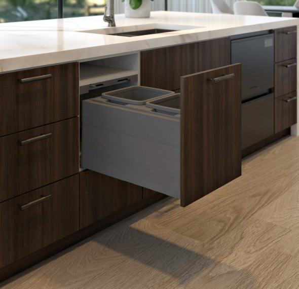 • Push to open — compatible with Blum Servodrive (electronic push to open) and Blum Tip-on-blumotion (manual push to open) systems. Simply bump on the door front and the bin will open.