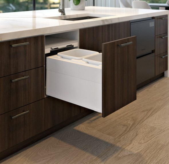 • Push to open — compatible with Blum Servodrive (electronic push to open) and Blum Tip-on-blumotion (manual push to open) systems. Simply bump on the door front and the bin will open.